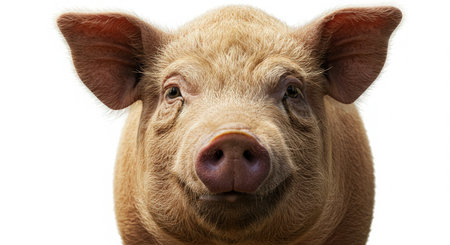 This image features a cute pink pig standing confidently against a white background, ideal for representing farm life and agriculture themes. The pig showcases its healthy form and cheerful personality, making it perfect for livestock-related content.