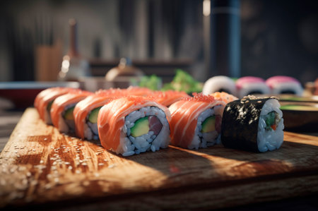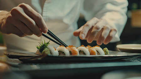 A skilled chef artfully prepares fresh sushi in a bustling restaurant. The vibrant colors of the sushi and precise techniques showcase the culinary artistry of Japanese cuisine.