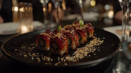 An exquisite arrangement of sushi rolls on a sleek black plate, highlighting vibrant colors and garnished with sesame seeds and herbs for a delightful culinary experience.