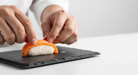 Close-up of hands carefully shaping salmon nigiri sushi on a textured black slate plate, set against a bright white background, highlighting the culinary artistry.