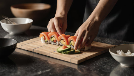 Culinary expert meticulously assembling sushi rolls with salmon and avocado on a bamboo mat in a contemporary kitchen, highlighting vibrant ingredients and craftsmanship