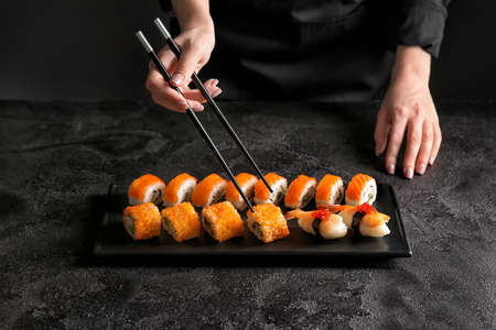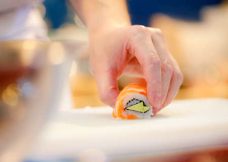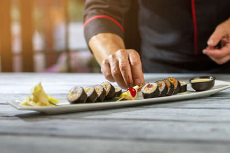 Japanese chef decorating sushi roll in japanese restaurant kitchen.