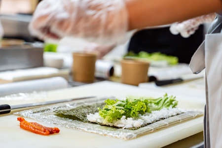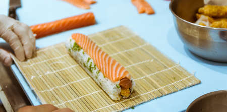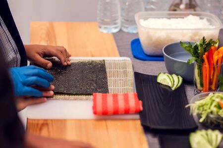 Process of making Japanese sushi rolls