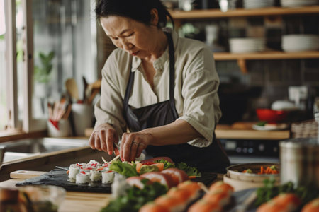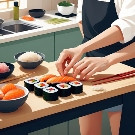 A person skillfully prepares sushi rolls in a contemporary kitchen filled with fresh ingredients and vibrant colors. The setting is bright, reflecting a joyful cooking atmosphere.
