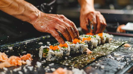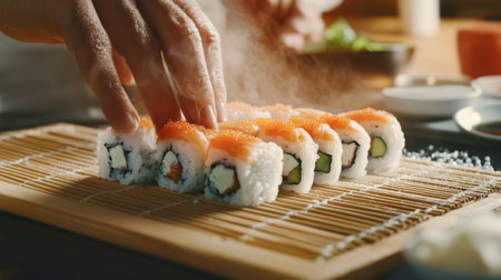 A skilled chef expertly rolls sushi on a bamboo mat, showcasing fresh ingredients and culinary artistry in a vibrant kitchen setting. Perfect for food lovers!