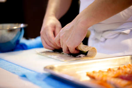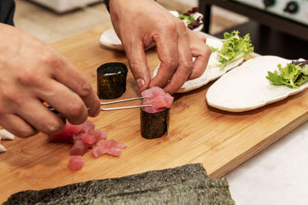 Male cook hands making sushi rolls, seafood
