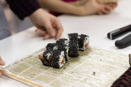 Children making sushi at the master class. Children, education and entertainment concept.