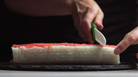 Chef cutting rolls of sushi with a knife on a stone board. - shot at a low angle. Beautiful female hands cut sushi.
