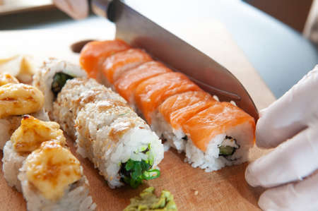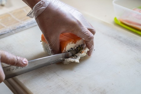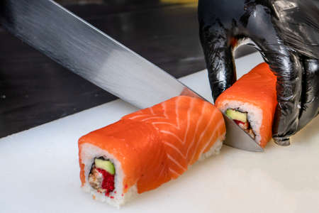Cut the sushi into pieces. Rolls, cooking. Japanese cuisine..