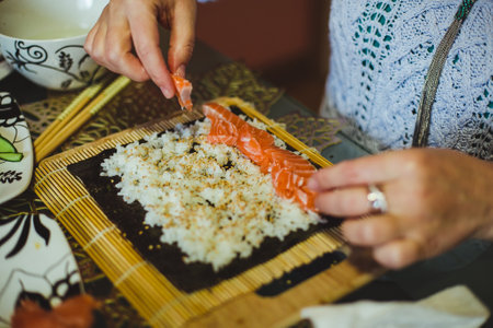 Close-up of female hands preparing sushi with salmon and rice.