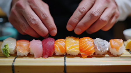 Professional Japanese sushi chef prepares the perfect traditional sushi following the ancient methods. The art of sushi making. AI generated