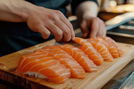 hands of chef preparing sashimi raw fish in a japanese restaurant