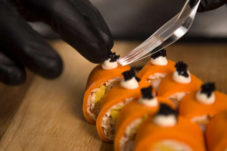 Sushi master serve Japanese No rice roll with tobiko caviar on wooden cutting board. Chef preparing food in black protective gloves. Close up of Sushi Roll serving. Professional Cooking process