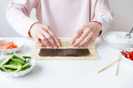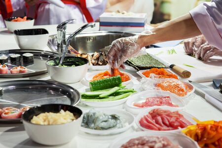 The process of preparing sushi from rice and additional ingredients at home 2019