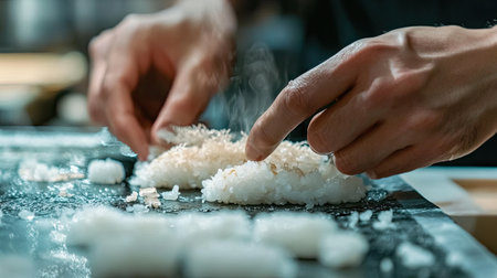 A chef meticulously shapes warm sushi rice with skilled hands in a bustling kitchen, showcasing the art of Japanese cuisine and inspiring culinary passion.