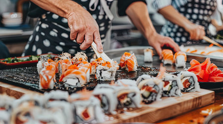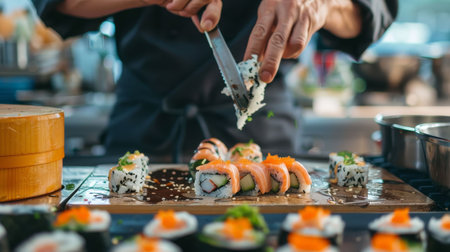 Sushi chef carefully placing sushi rolls on a platter, creating an appealing presentation of japanese cuisine