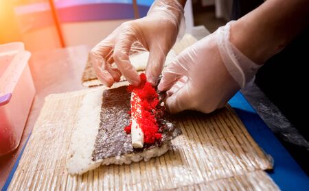 Process of making sushi and rolls at restaurant kitchen. Chefs hands with knife.