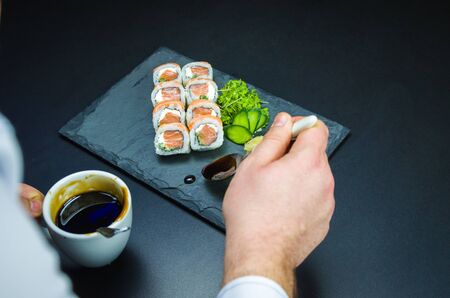 Male person eats sushi rolls with chopsticks