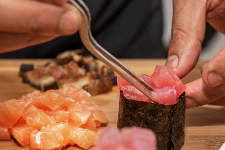 The chef preparing red tuna gunkan and nori seaweed with his metal tongs