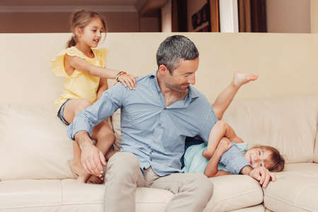 Father and daughters girls kids at home spending time together. Parent playing with children. Family having fun hugging and laughing. Real people lifestyle. Fathers day holiday concept.