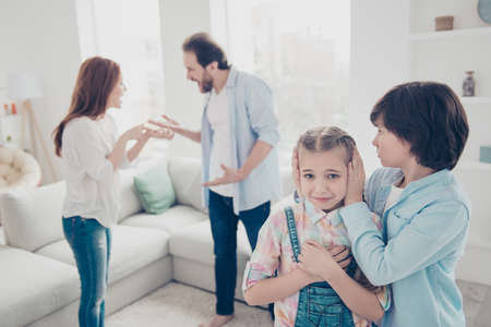 Portrait of nervous annoyed daddy and mom screaming at each other gesturing with hands on blurred background, older brother closing ears of upset misery sister. Crisis disagreement concept