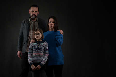 Refugee family with one child looking at camera on black background, Ukraine war concept.
