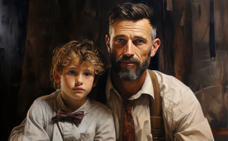 A stylish man with a beard sitting next to a boy. Father and son, two generations, Stage image, retro style. Portrait of a man. Oil painting in retro style. Men's beauty, fashion.