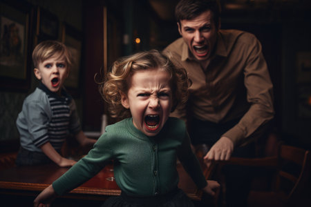 angry father and kids in the living room, Angry screaming child with desperate parents, AI Generated