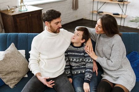 happy family portrait - couple and little son sitting on sofa in living room