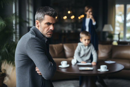 man in a depressed mood, wife and child in the background, family problems