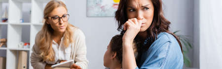 crying mother bringing daughter to psychologist, banner