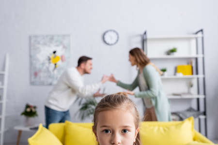 Girl looking at camera with blurred parents quarrelling at background at home