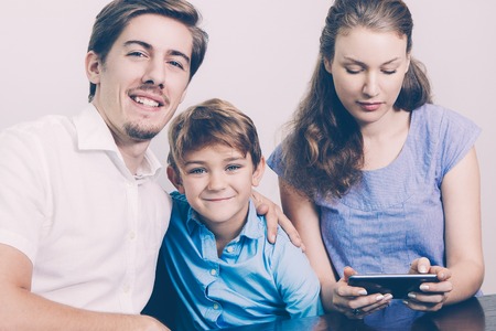 Portrait of smiling father, mother and son. Happy family spending time together at home. Cute boy with mom and dad playing at home. Time to family leisure. Family values.