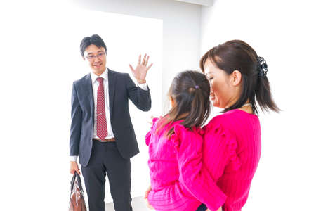 The Asian family in casual clothes standing on the pink background.