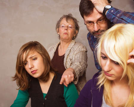 Angry parents. Emotional unhappy young parents standing around their daughter and shouting at her while expressing their anger