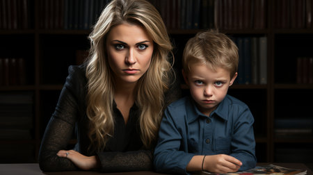 Portrait of successful businesswoman with toddler son wearing formalwear isolated on dark background. Family business concept. Generative AI