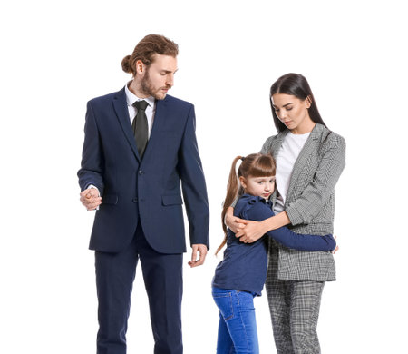 Unhappy family after quarrel on white background