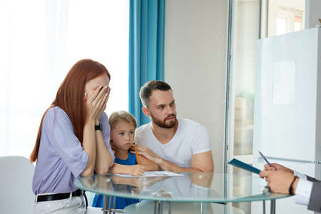 professional psychologist support young married family with daughter, they discuss problems, save family, talk about possible guardianship