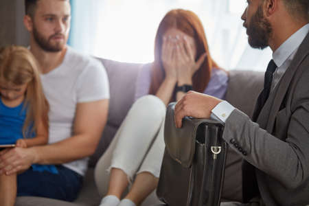 Registration of guardianship of little girl. Family in office of family lawyer. Young man and beautiful woman decide who will be main guardian of little girl.