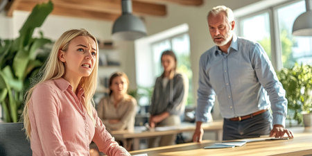 Workplace Conflict Young Woman Distressed by Dominant Male Colleague s Behavior in Office