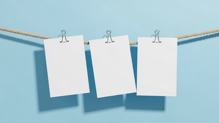 Three blank white papers are clipped to a rope against a bright blue background, casting shadows.
