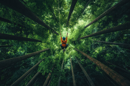 A person is hanging from an aerial beam in the forest, with trees and green leaves behind them. The wooden beams stretch across the sky like long surfaces, adding visual depth to the scene. They wear safety gear such as helmet, shoes, gloves or shorts for protection during adventure activities. This photo was taken using Canon EOS R5 camera. --ar 3:2 --v 6.1 Job ID: c43b7f46-1fc2-4ecc-8a9d-07ffaa986b3e