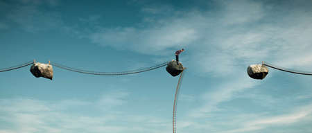 Man standing on roll of dollar bills balancing tightrope, with blue sky background.