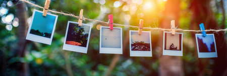 Polaroid pictures hang on a string with colorful clothespins, set against a lush natural background during daylight hours.