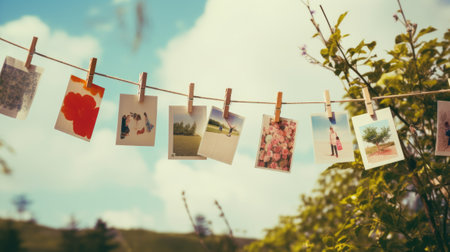 Colorful polaroid photos hang on string, showcasing cherished moments in a sunny outdoor space filled with vibrant hues.
