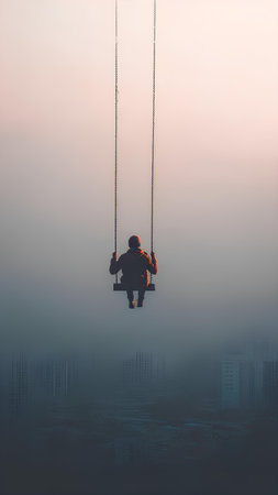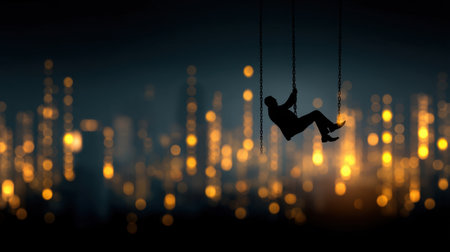 Person swings chain swing against backdrop of glowing city lights, creating serene and contemplative atmosphere. silhouette contrasts beautifully with warm bokeh effect of lights, evoking feelings