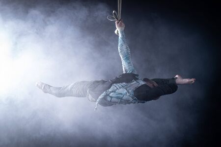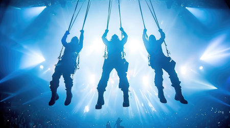 Three performers are skillfully suspended from above, performing aerial stunts in dramatic lighting.