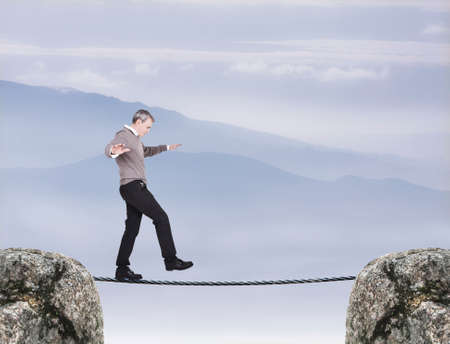 businessman walks on a tightrope over a sea full of mines. concept of risk and danger.