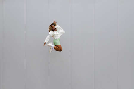 Young african american adult woman with long blond braids looking at camera jumping in the air. Copy space.