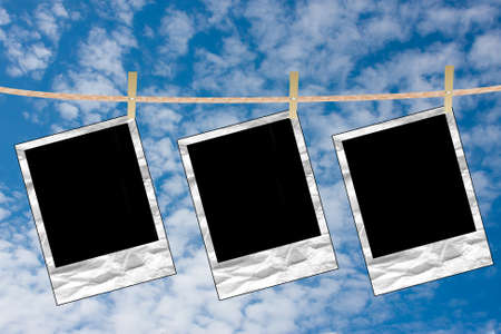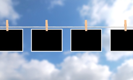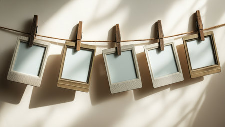 Against the background of a light wall, photo frames hang on a rope on clothespins